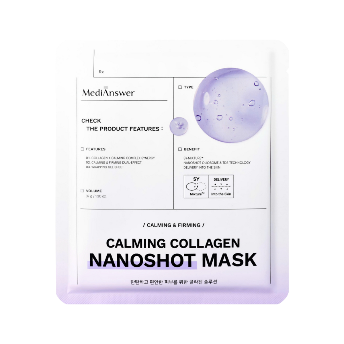 Medianswer Calming Collagen Nanoshot Mask là giải pháp làm dịu và phục hồi da nhạy cảm với công nghệ Collagen siêu phân tử 100Da kết hợp lớp mặt nạ thạch ôm khít da. Nhờ ứng dụng các công nghệ dẫn truyền tiên tiến như Oleosome và Liposome, sản phẩm giúp tăng khả năng thẩm thấu dưỡng chất, làm dịu, củng cố hàng rào bảo vệ và duy trì độ ẩm tối ưu cho làn da.